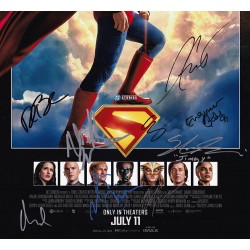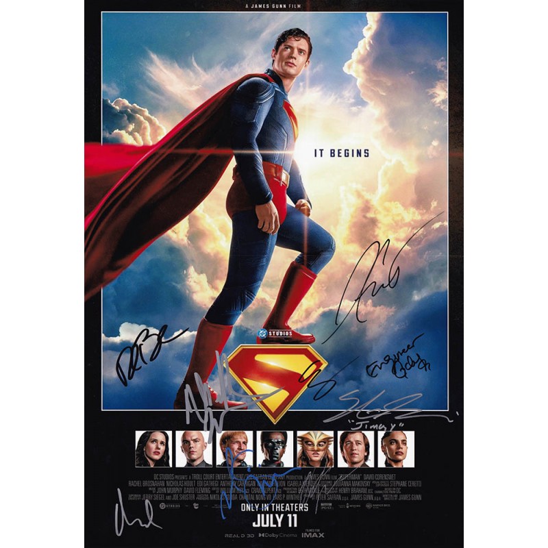 Movie memorabilia autographed by David Corenswet, Rachel Brosnahan, Nicholas Hoult, Skyler Gisondo, María Gabriela de Faría, Nathan Fillion, Edi Gathegi, Isabela Merced, and Anthony Carrigan.