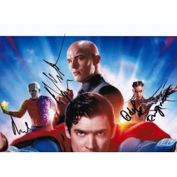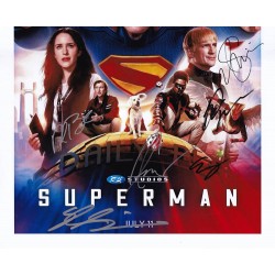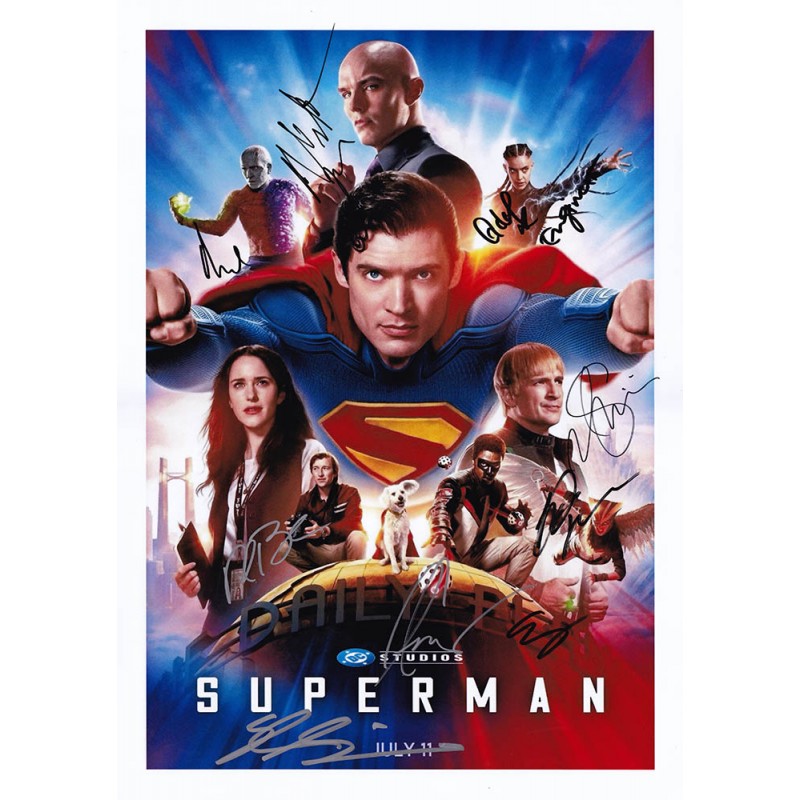 Movie memorabilia autographed by David Corenswet, Rachel Brosnahan, Nicholas Hoult, Skyler Gisondo, María Gabriela de Faría, Nathan Fillion, Edi Gathegi, Isabela Merced, and Anthony Carrigan.