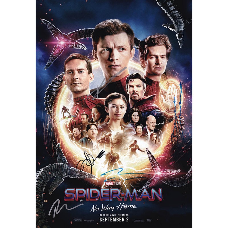 Movie memorabilia autographed by Tom Holland, Tobey Maguire, Andrew Garfield, Zendaya, and Benedict Cumberbatch.