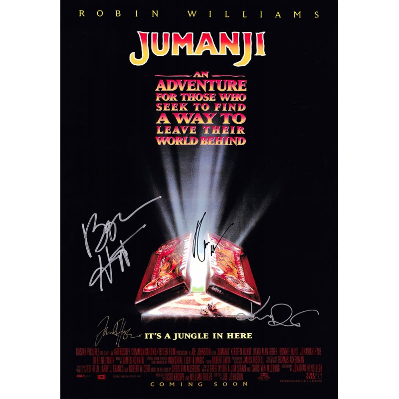 Movie memorabilia autographed by Robin Williams, Kirsten Dunst, Bonnie Hunt, and Jonathan Hyde.