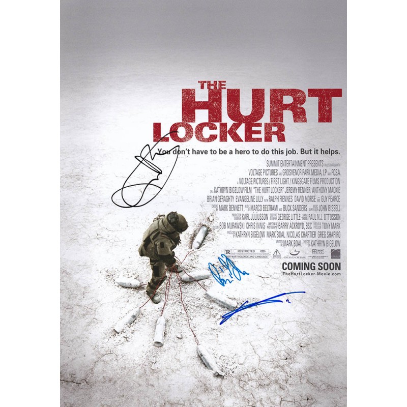 Movie memorabilia autographed by Jeremy Renner, Anthony Mackie, and Brian Geraghty.