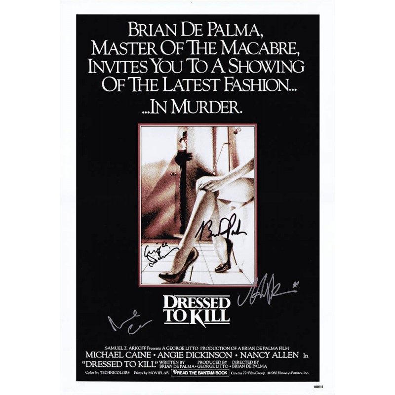 Movie memorabilia autographed by Michael Caine, Angie Dickinson, Nancy Allen, and director Brian De Palma.