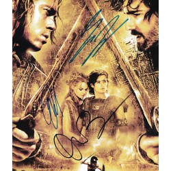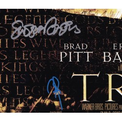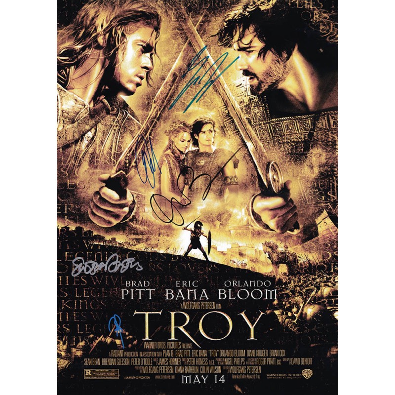 Movie memorabilia autographed by Brad Pitt, Orlando Bloom, Eric Bana, Diane Kruger, and Saffron Burrows.