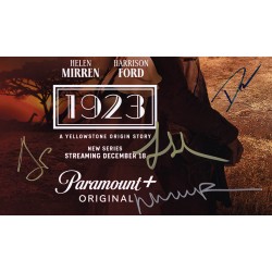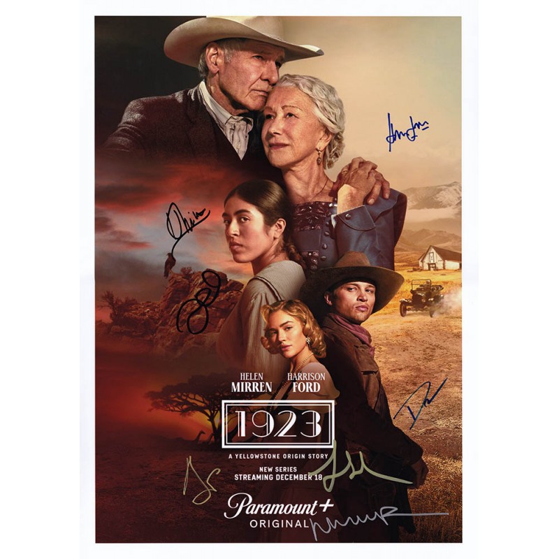 Television memorabilia autographed by Harrison Ford, Helen Mirren, Brandon Sklenar, Darren Mann, Julia Schlaepfer, and Aminah Nieves.