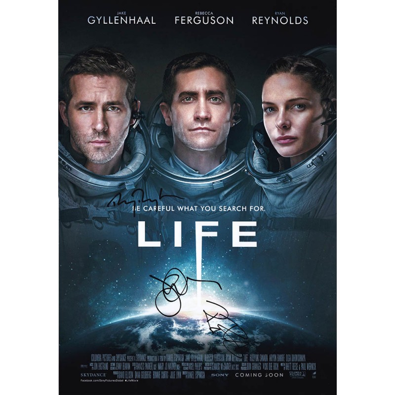 Movie memorabilia autographed by Jake Gyllenhaal, Rebecca Ferguson, and Ryan Reynolds.