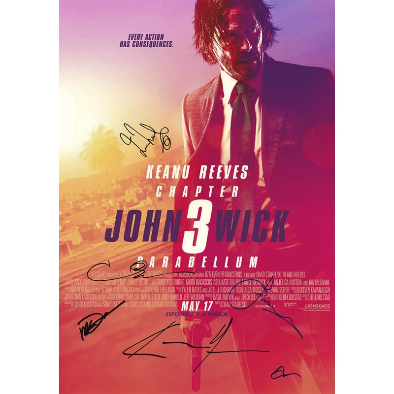 Movie memorabilia autographed by Keanu Reeves, Halle Berry, Laurence Fishburne, Ian McShane, Asia Kate Dillon, and Mark Dacascos.