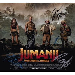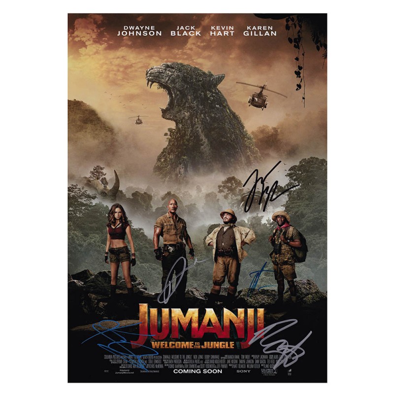 Movie memorabilia autographed by Dwayne Johnson, Karen Gillan, Kevin Hart, Nick Jonas, and Jack Black.