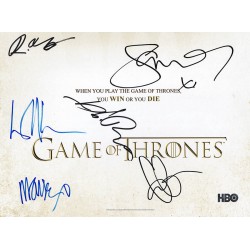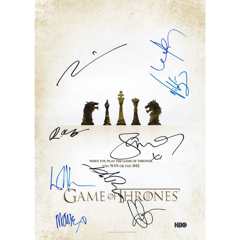 Television memorabilia autographed by Kit Harington, Maisie Williams, Peter Dinklage, Emilia Clarke, Isaac Hempstead Wright, Sophie Turner, John Bradley, Nikolaj Coster, and Lena Headey.