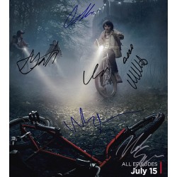 Television memorabilia autographed by Winona Ryder, Millie Bobby Brown, Gaten Matarazzo, Finn Wolfhard, Caleb McLaughlin, and Noah Schnapp.