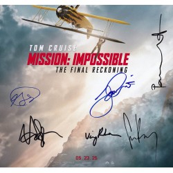 Movie memorabilia autographed by Tom Cruise, Hayley Atwell, Ving Rhames, Simon Pegg, Greg Tarzan Davis, and Pom Klementieff.