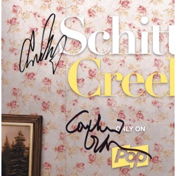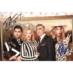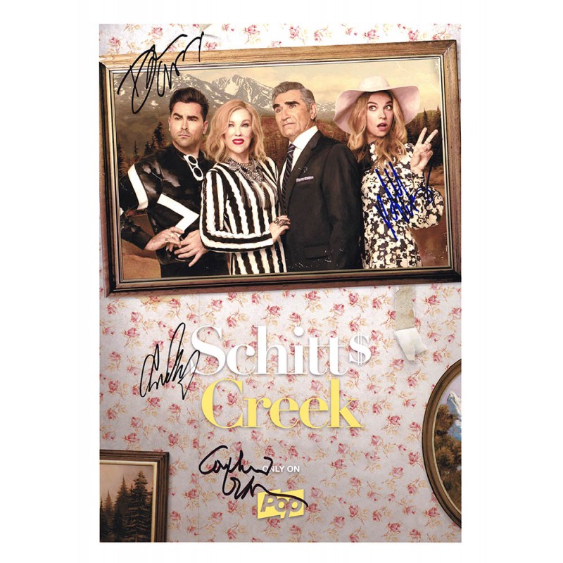 Television memorabilia autographed by Eugene Levy, Catherine O'Hara, Annie Murphy, and Dan Levy.