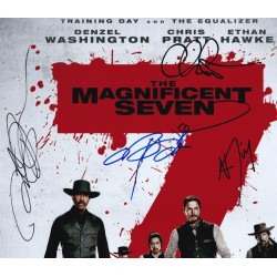 Movie memorabilia autographed by Denzel Washington, Chris Pratt, Ethan Hawke, Lee Byung-hun, Martin Sensmeier, Manuel Garcia-Rulfo, and Vincent D'Onofrio.