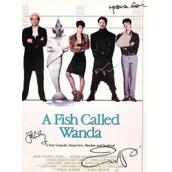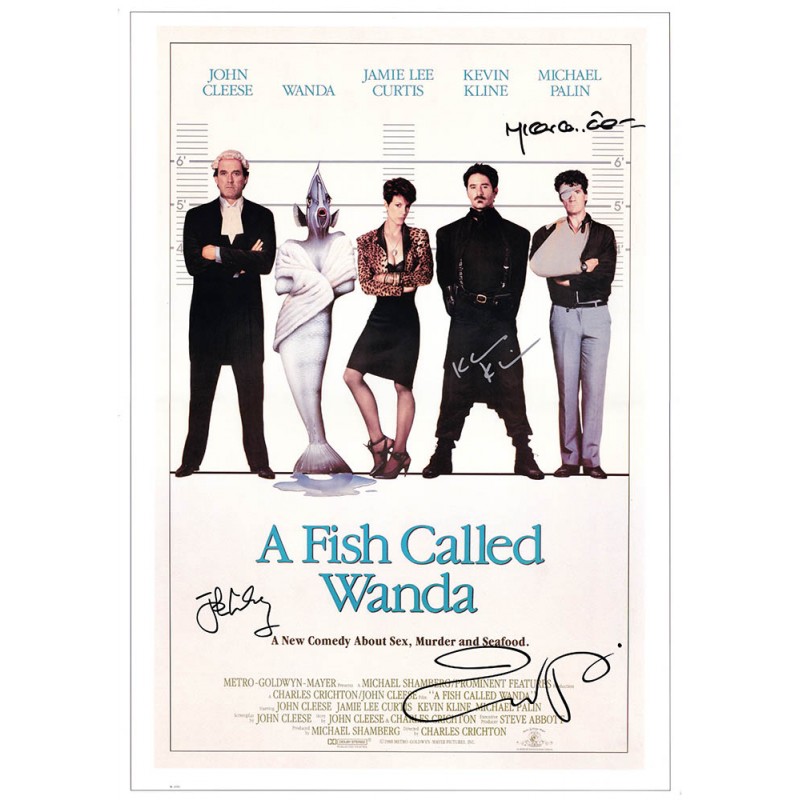 Movie memorabilia autographed by Jamie Lee Curtis, John Cleese, Kevin Kline, and Michael Palin.