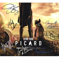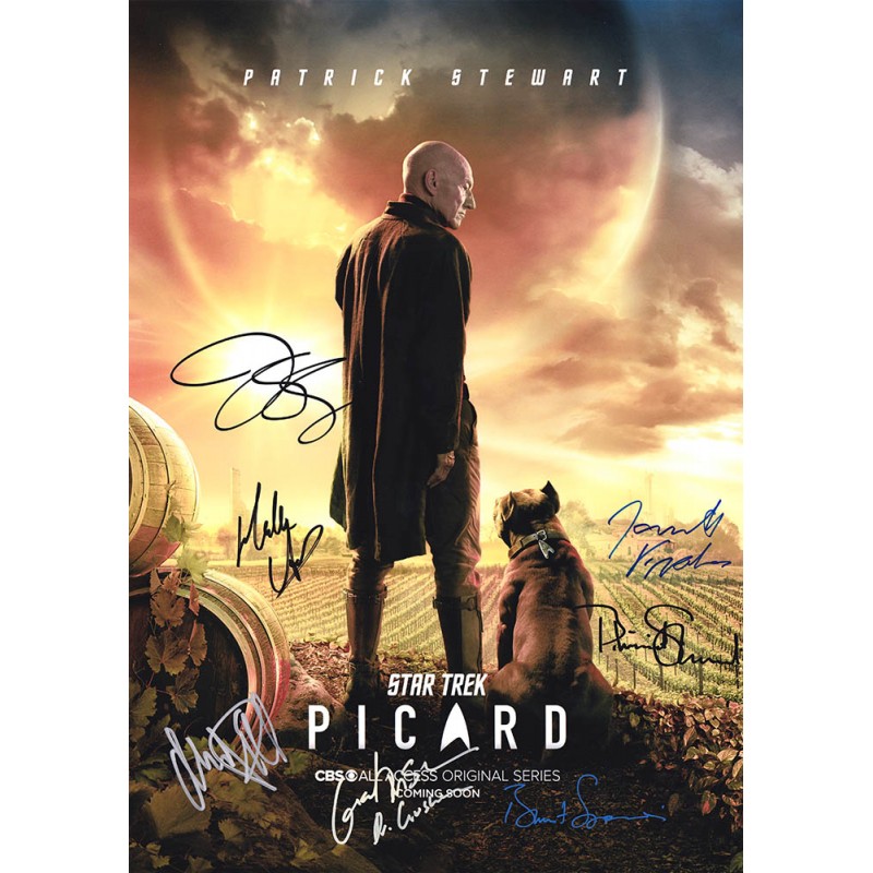 Television memorabilia autographed by Patrick Stewart, Michelle Hurd, Jeri Ryan, Jonathan Frakes, Brent Spiner, Gates McFadden, and Alison Pill.