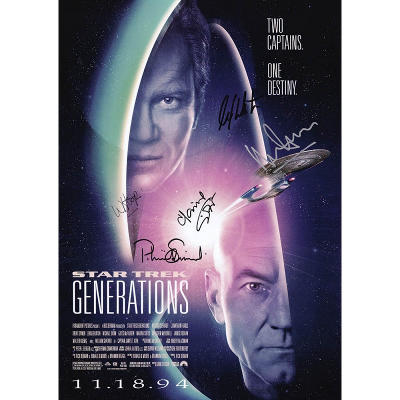 Movie memorabilia autographed by William Shatner, Patrick Stewart, Malcolm McDowell, Whoopi Goldberg, and Marina Sirtis.