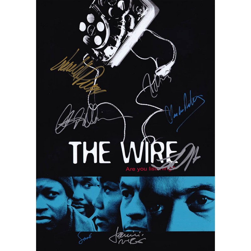 Television memorabilia autographed by Dominic West, Sonja Sohn, Seth Gilliam, Lance Reddick, Wendell Pierce, Clarke Peters, and Idris Elba.