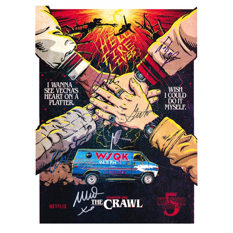 Television memorabilia autographed by Finn Wolfhard, Caleb McLaughlin, Gaten Matarazzo, Noah Schnapp, and Millie Bobby Brown.